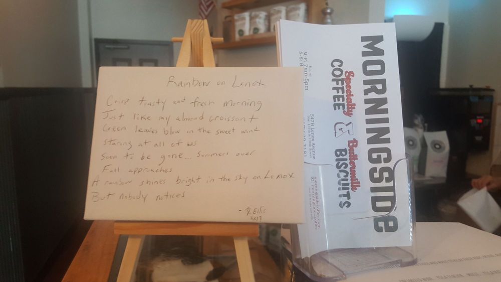 Whether you wish to dine in or take out, Morningside offers a welcoming atmosphere, great service, and community poetry on its walls, making it an ideal spot for both relaxation and productivity.